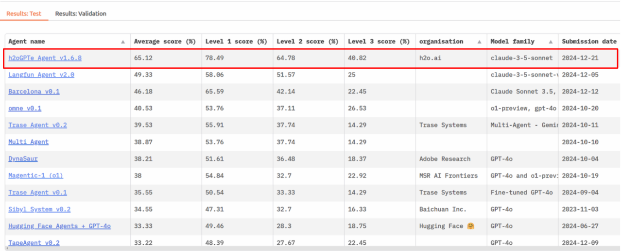 We're excited to announce that our h2oGPTe Agent has achieved the top position on the GAIA (General AI Assistants, https://arxiv.org/abs/2311.12983) benchmark leaderboard (https://huggingface.co/spaces/gaia-benchmark/leaderboard), with a remarkable score of 65% - significantly outperforming other major players in the field. This achievement marks an important milestone in our journey toward building more capable and practical AI systems.