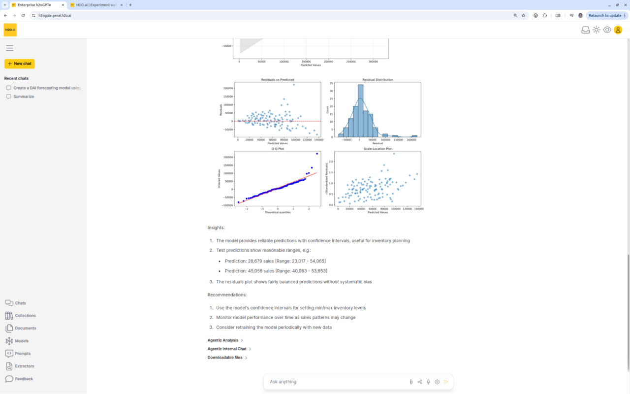 Enterprise h2oGPTe easily runs DriverlessAI or other machine learning platforms, including for time-series forecasting, from a simple prompt, providing results, insights, and recommendations.