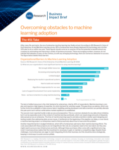 After many fits and starts, the era of enterprise machine learning has finally arrived. According to 451 Research’s Voice of the Enterprise, AI and Machine Learning survey, 20% of enterprises have already deployed the technology and a further 33% plan to do so within one year. These figures should come as no surprise: AI has the potential to benefit almost any company by automating and improving a variety of business processes. These encouraging numbers, however, do not indicate that adoption is easy; on the contrary, as with any emerging technology, there are numerous obstacles to success. The figure below details these barriers.
