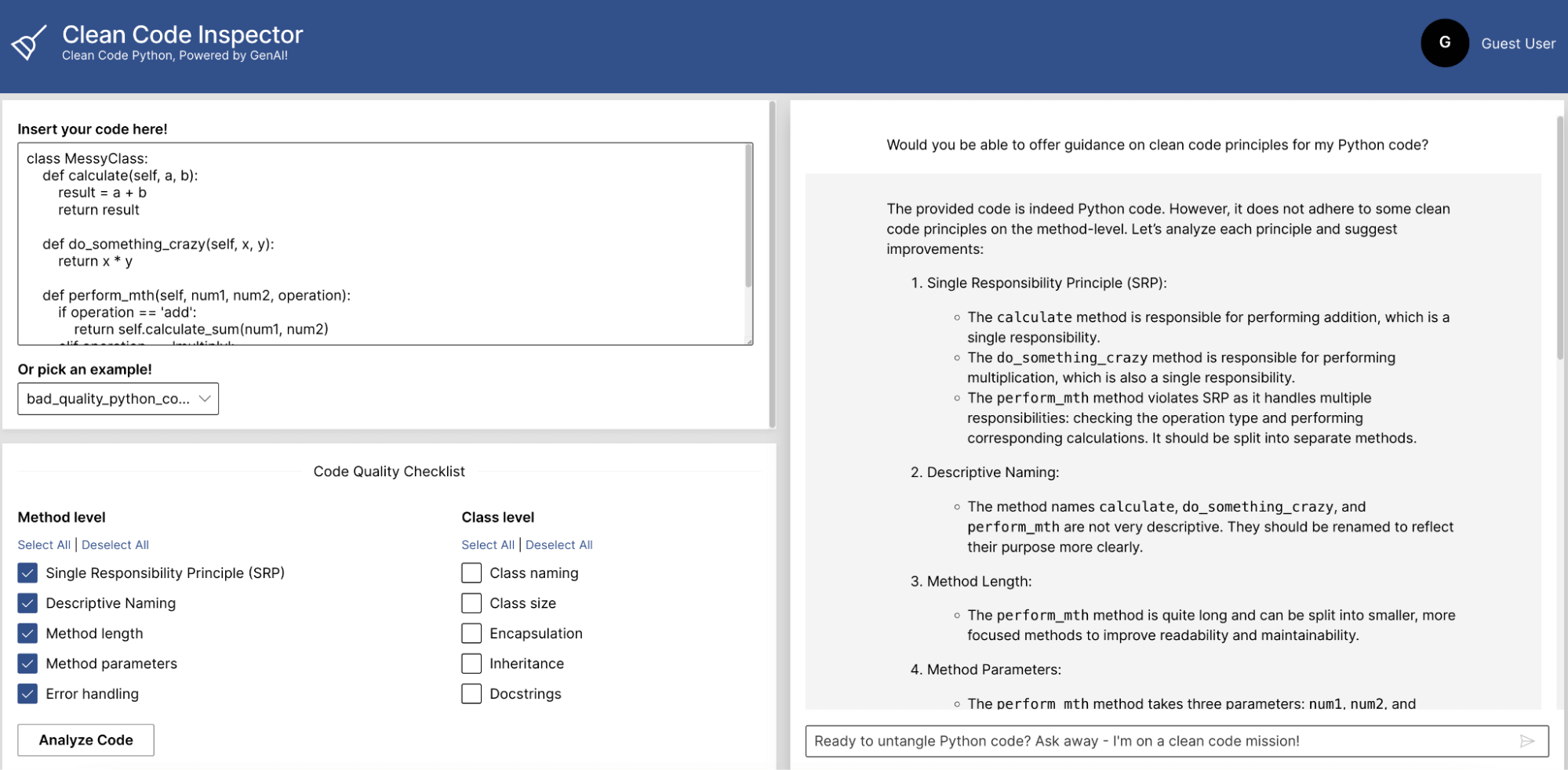 If you’re a python developer, or want to start writing your own GenAI apps, the Clean Code app is for you! It offers assistance in writing amazing and easy-to-follow Python code.