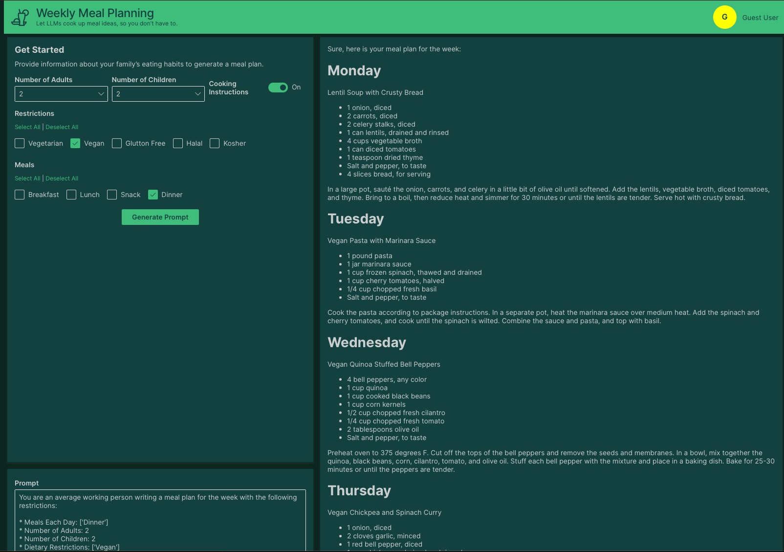 Why spend 3+ hours meal planning when you could spend under 3 minutes for the entire week? Weekly Meal Planning allows you to customize which meals you would like, how many people you have, and whether you want cooking instructions. It then customizes a prompt for you which you can edit yourself - maybe you only want Cuban cuisine - before sending to a Large Language Model for a customized meal plan.
