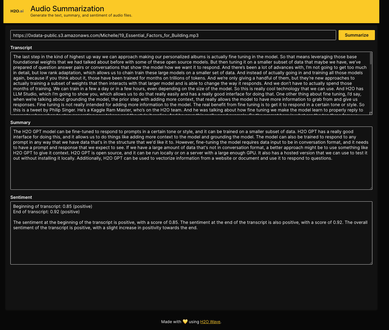 Combining the power of H2O open source technology with open-source model Whisper, the Transcribe and Summarize app will do exactly that: take any public mp3 file and transcribe, summarize, and get the sentiment.