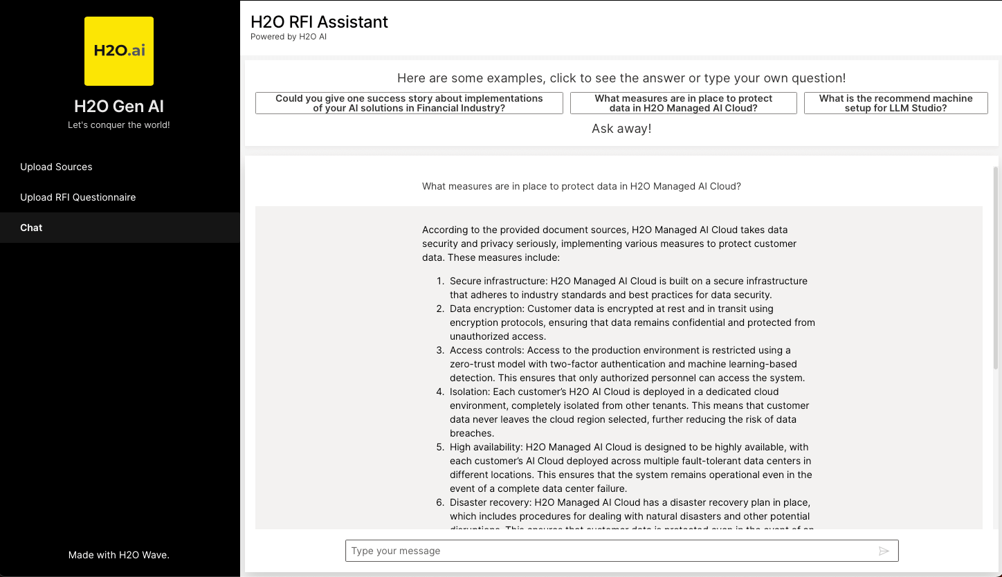 The RFI Assistant simplifies the process of answering Requests for Information (RFIs). In the H2O GenAI App Store, this app is contextualized with H2O product information, but could run on any collection data to help anyone answering an RFI.