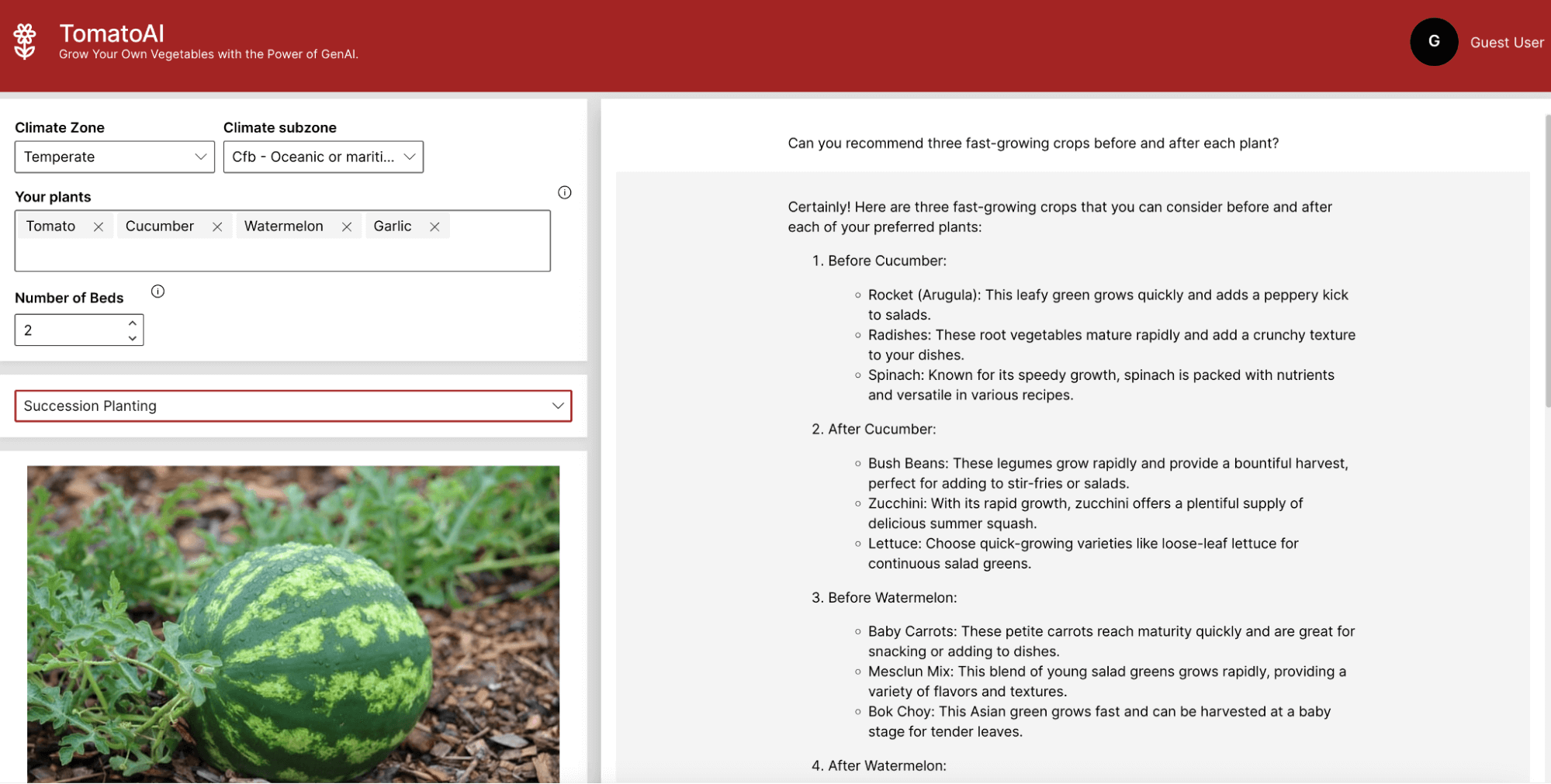Grow a thriving vegetable garden by getting expert AI help for growing the plants you want in your specific sub-climate. TomatoAI can help you with specific topics like “What is succession planting and how do I do it successfully in the tundra?” and with open ended questions you might have.