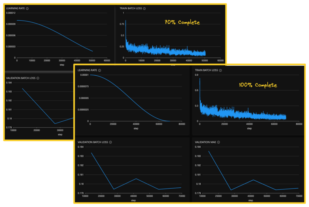 On clicking the View experiments tab, we are presented with multiple options to analyze our experiments. These options allow us to examine various aspects of the experiment, such as the learning rate, train and validation batch losses, and validation MAE. By doing so, we can gain insights about the experiment in real-time as it is running and after it has been completed. Below we can see the metrics both when the model’s training is 70% complete as well as when it is 100% complete.