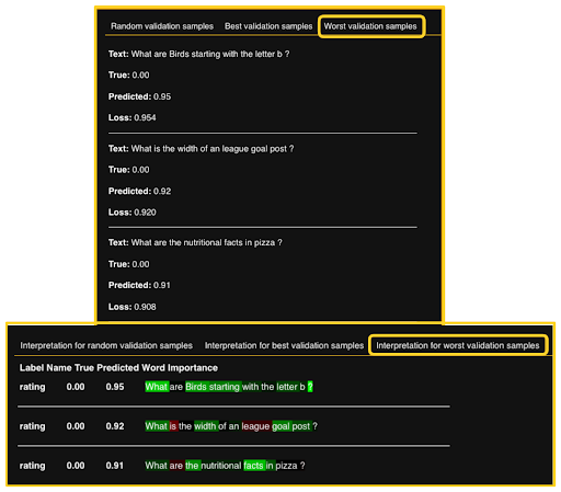 The Validation Prediction Insights tab visualizes an experiment’s validation samples displaying each sample’s loss value. One of the most interesting aspects is analyzing the samples that posed the greatest challenge to the model. This can lead to two possible scenarios — either the data subset is inaccurately labeled, or the model faces difficulties performing well.