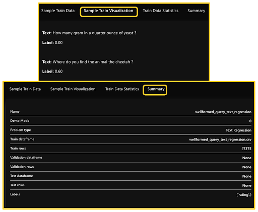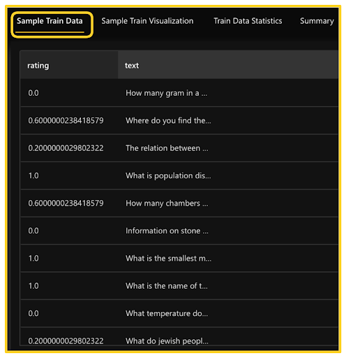 Let’s begin by exploring the dataset and looking at a few training data samples. In the H2O Hydrogen Torch navigation menu, clicking the View datasets tab gives us multiple options to understand our data better. We can look at the sample training data consisting of a text column and its corresponding rating in another column.