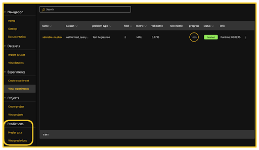 Once the model training is completed, multiple tasks can be carried out, including generating predictions on a new dataset, retrieving logs and technical details, and obtaining out-of-fold predictions on the training dataset. The predictions can be downloaded and analyzed externally to optimize the model’s performance or integrated with other external tools.