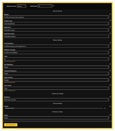 It should be noted that the experiment settings vary based on the selected experience level. We have utilized the default settings for most except for the number of epochs. Currently, our experiment preview page appears as follows: