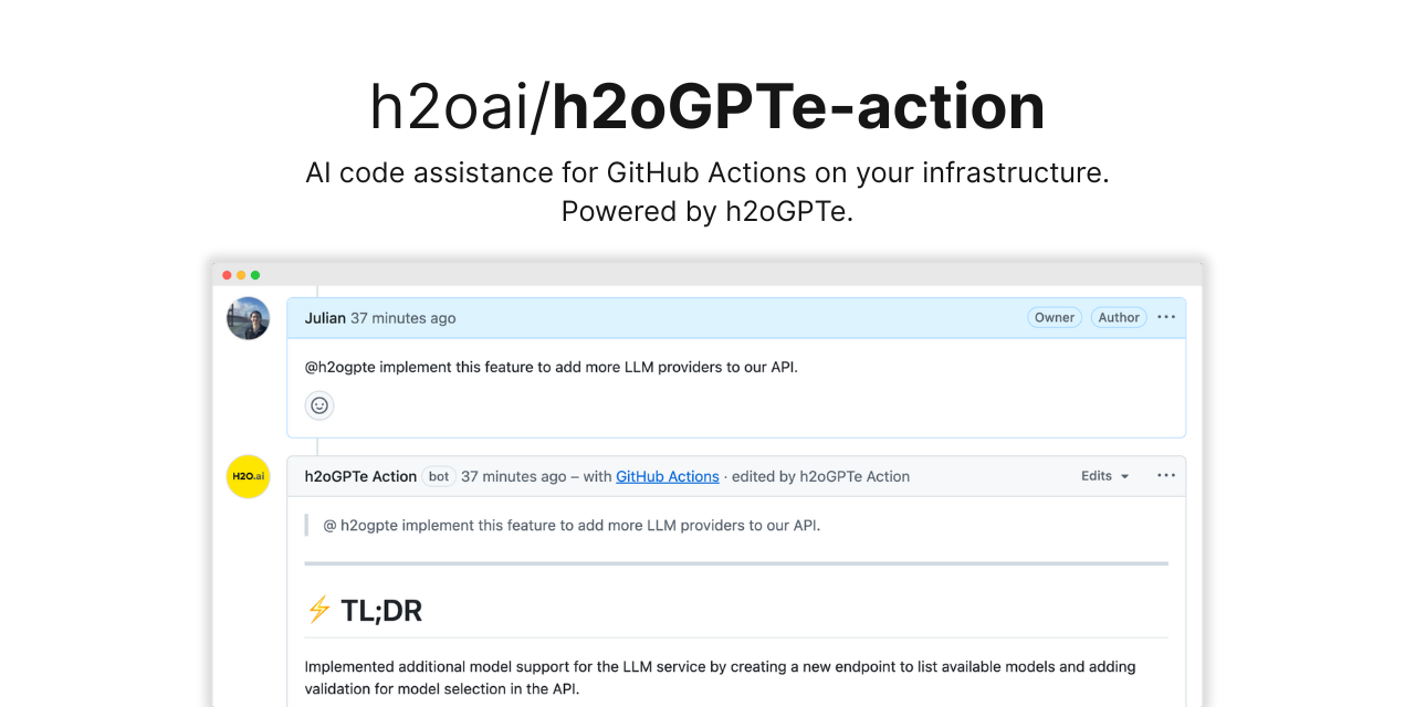 Over the last few months we’ve been integrating H2O.ai’s flagship Agentic AI into GitHub and we’re excited to finally release the tool to the community. We built the tool to enhance the developer lifecycle in GitHub. Simply tag @h2ogpte in a pull request or issue comment and let the world’s best agentic AI review your code, suggest chan...
