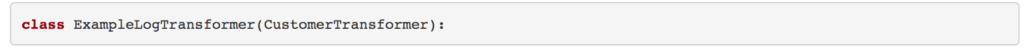 The ExampleLogTransformer is the class name of the transformer that is being newly created. And in the parenthesis the CustomTransformer is being extended.