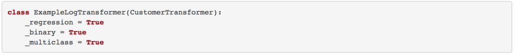 In the above example, we are building a log10 transformer, and this transformer is an application, for a regression, binary, or a multiclass problem. Therefore we set all of those as True.