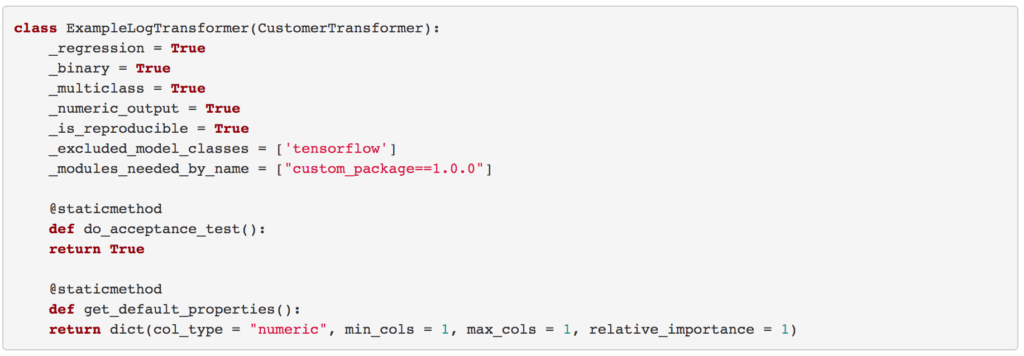 Depending on what kind of outcome the custom transformer is solving, each one of the above needs to be enabled or disabled. And the following example will show you how this can be done